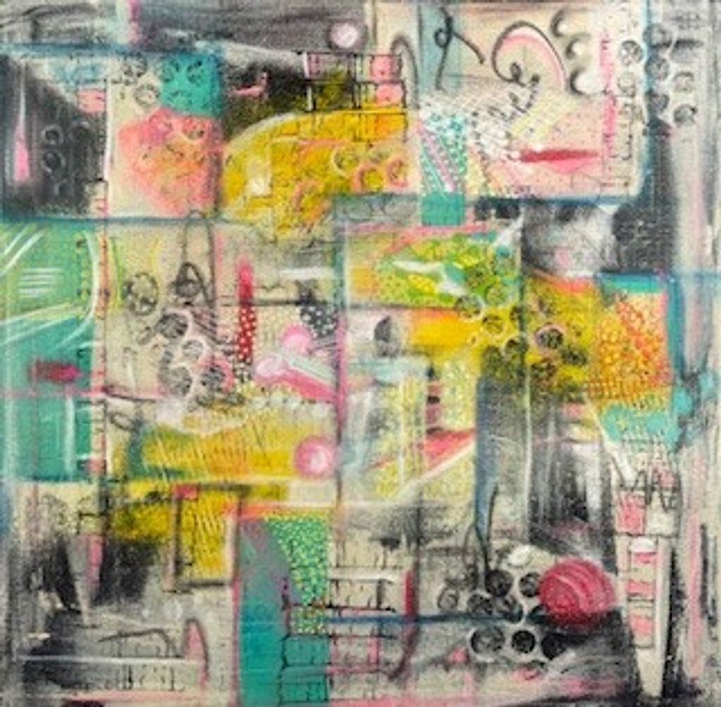 CARNIVAL II- Acrylic, oil pastels, paper, ink on canvas. 24' x 24' POR